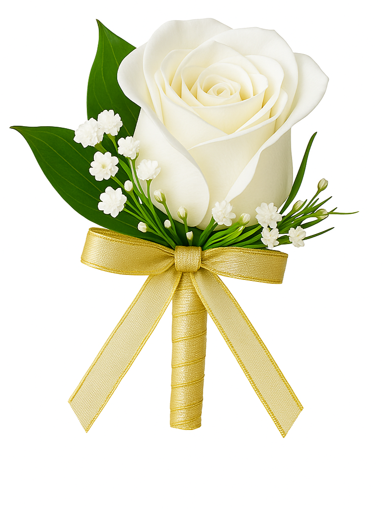 Un detalle clásico y distinguido que realza la elegancia del gran día. La rosa blanca adornada “Novio” está acompañada de delicadas flores blancas y hojas frescas, finalizada con un lazo dorado que le otorga un toque de sofisticación.