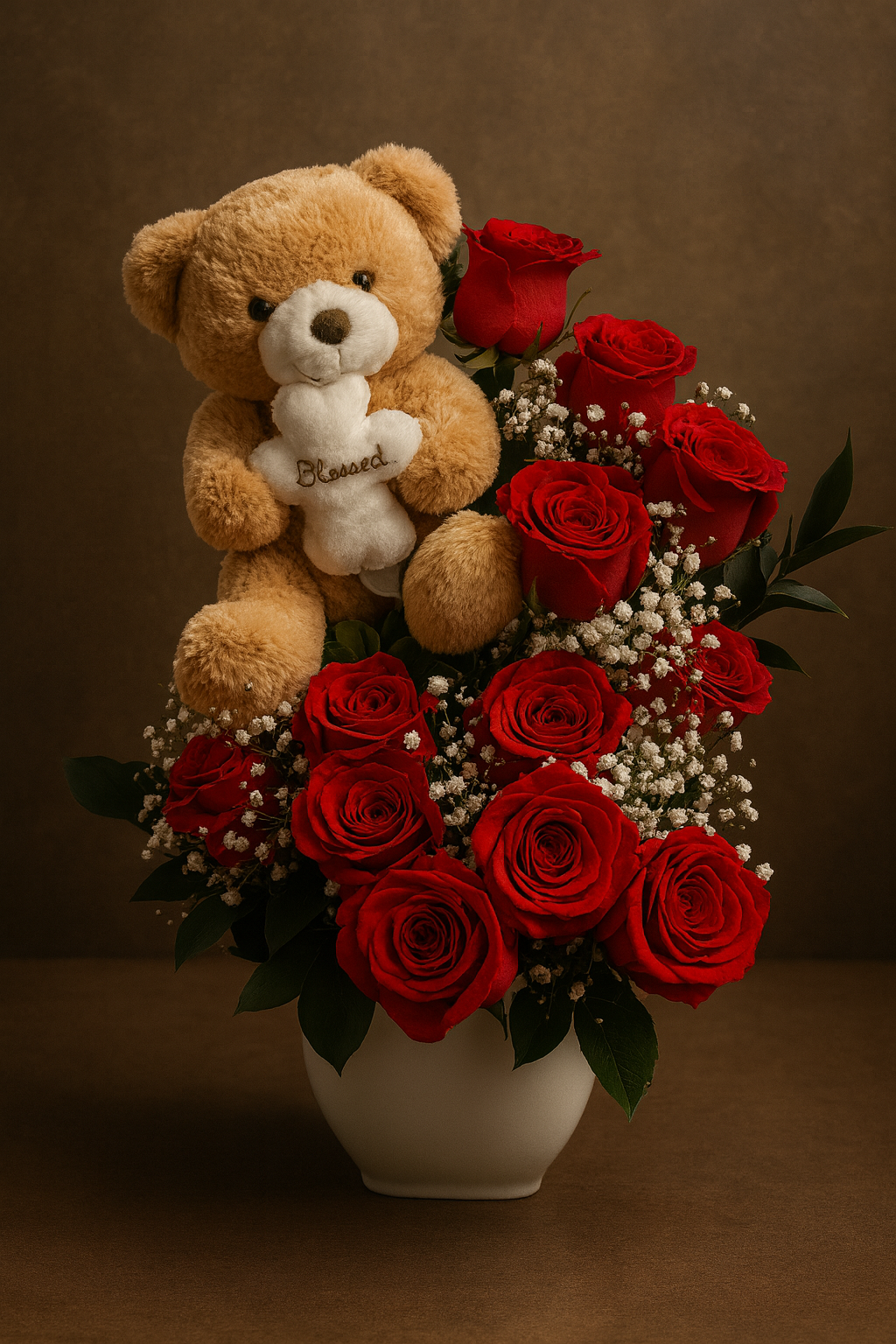 El Arreglo de Amor con Peluche es el regalo perfecto para sorprender con ternura y romanticismo. Combina la elegancia de las rosas frescas con la dulzura de un adorable peluche, creando un detalle único que transmite cariño, afecto y complicidad.
