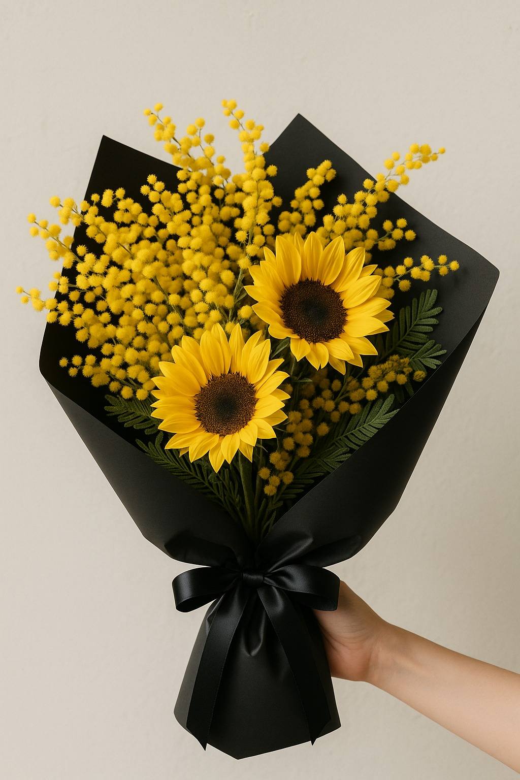 Un diseño elegante y moderno que combina la fuerza del girasol con la delicadeza de la mimosa amarilla, envueltos en un sofisticado papel negro con lazo satinado.